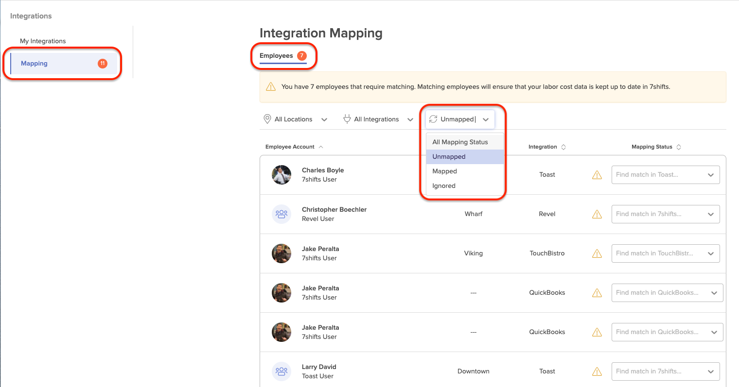 7shifts will automatically map any Employees that already exist between your POS and 7shifts (if they are both spelled the same way). You'll find those under the 'Mapped' heading.