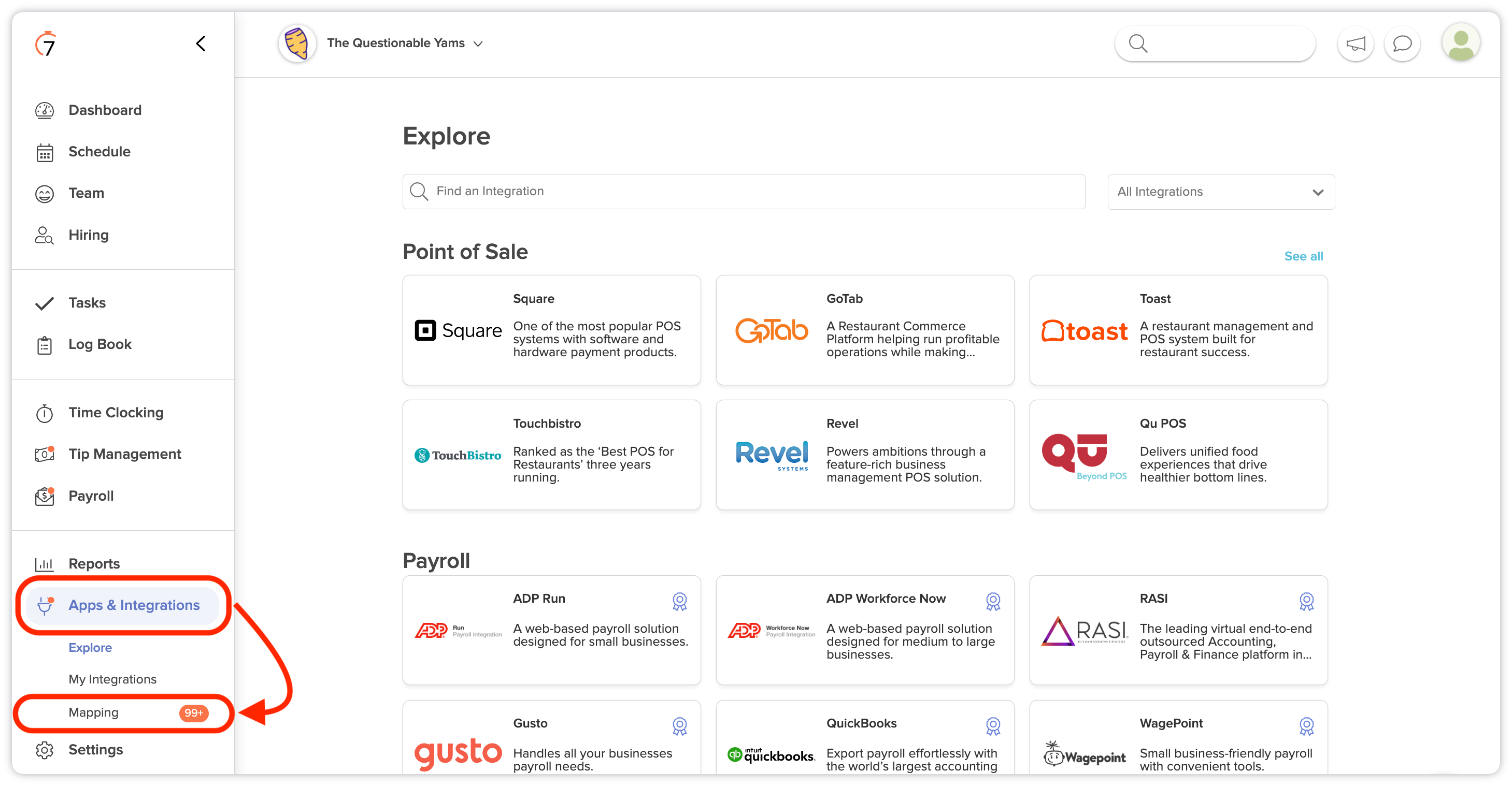 1. Log into your 7shifts account and head to Apps & Integrations, in the left navigation bar: