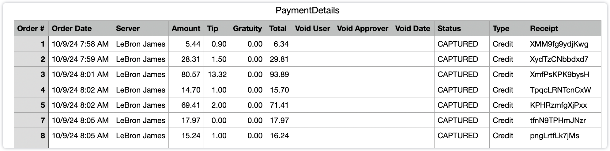 - Details: Shows server name, totals, tips, autogratuities, date, and time. This may require manipulation after download. 7punches must be used for time clocking.