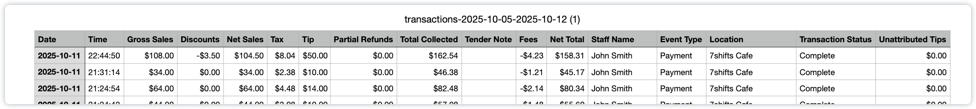 Details: Navigate to Reports > Payments > Payments. Set the required date range. Before exporting, ensure these columns are selected: Location, Order, Date, Server, Amount, Tip, Gratuity, Total, and Status.
