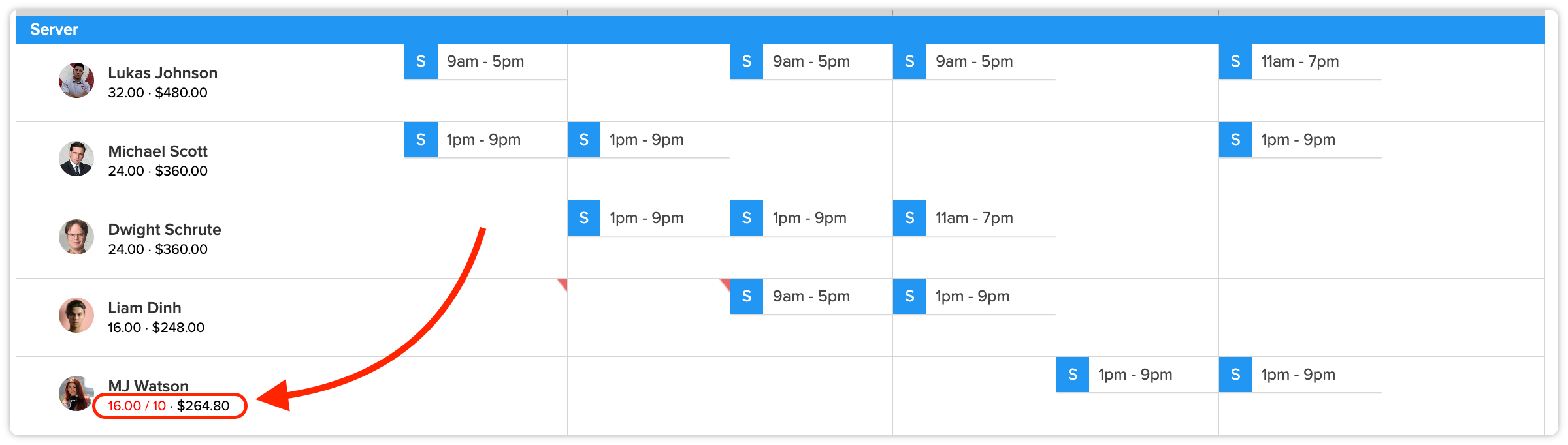 For example: MJ has been scheduled for more hours than their max weekly hours (10 hours). MJ will not see this number on their end, it is only visible to Managers with scheduling permissions: