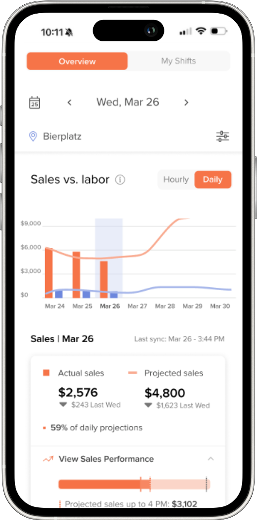 By syncing your POS data with 7shifts, you gain valuable insights into your sales and labor data, both on the web and through the mobile app. This level of granularity lets you identify peak hours, trends, and areas of improvement and allows you to optimize your operations. Empower your management team to make informed staffing decisions, optimize your labor percentage, and ensure that your team is aligned on business objectives.
