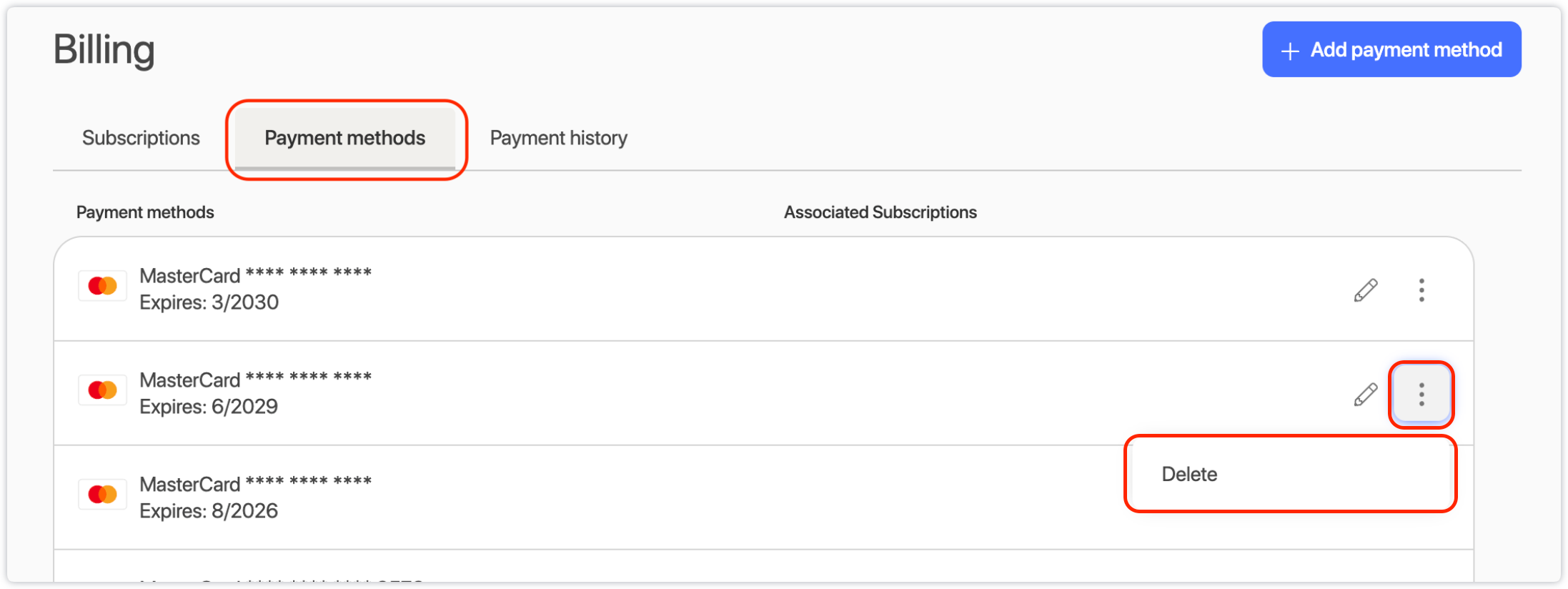 Important: If the payment method you are looking to delete is linked to one or more subscriptions. It can't be deleted until it's removed from the subscription list.