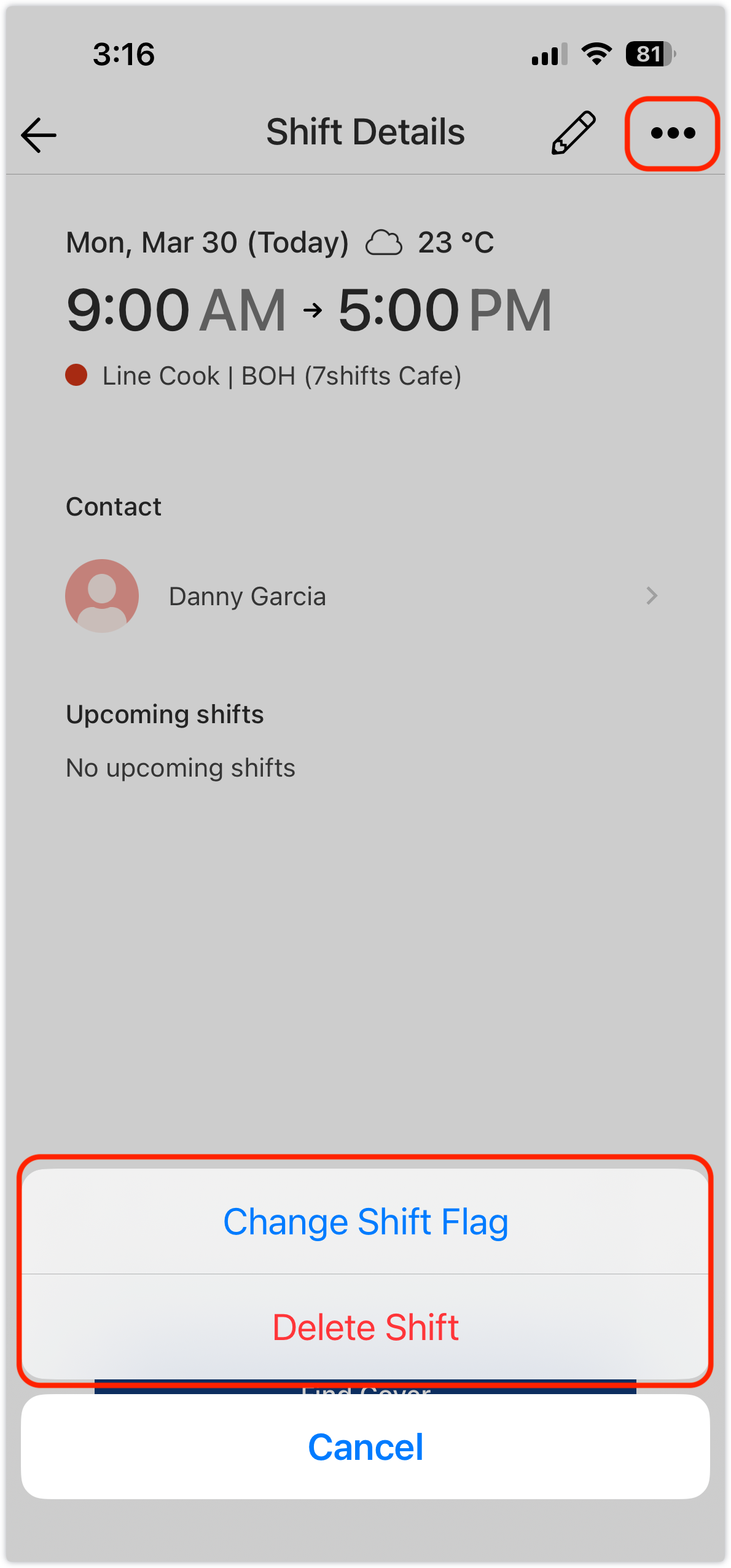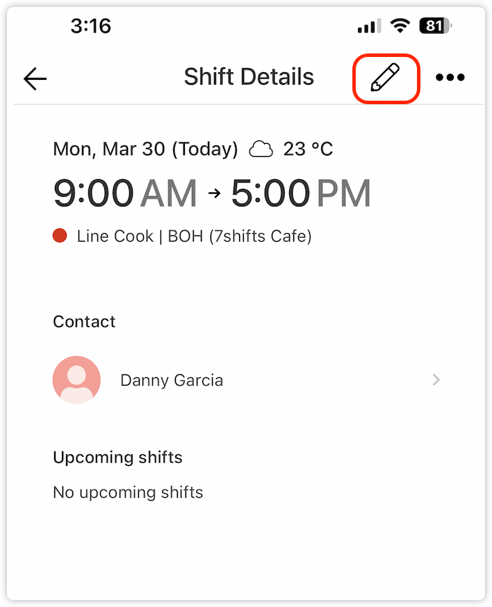 Tap the Pencil icon to edit shift details or use the three dots menu to delete the shift or change Shift Flag.