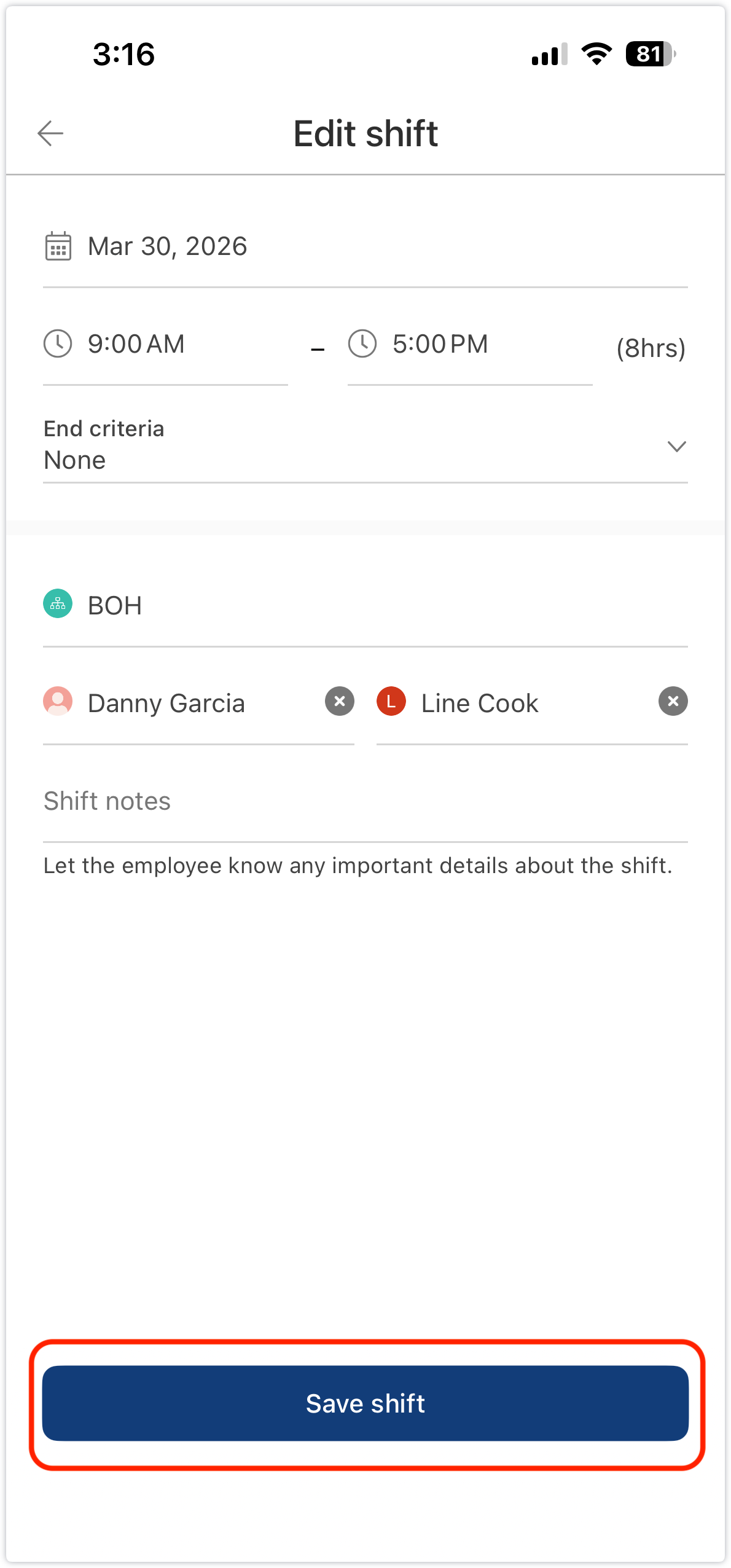 - Make the necessary changes to the shift details.