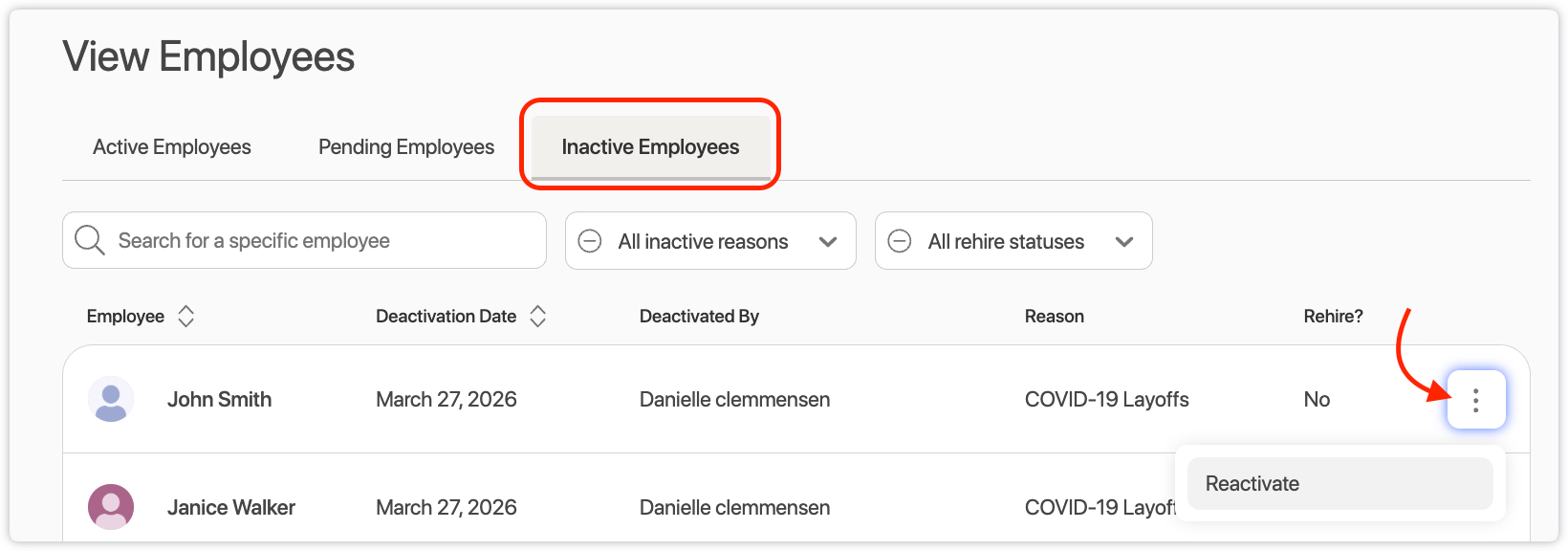 - Search for a specific user or filter the Inactive Employee list by the deactivation reason and rehire status. You can also sort the list of inactive Employees by name or deactivation date: