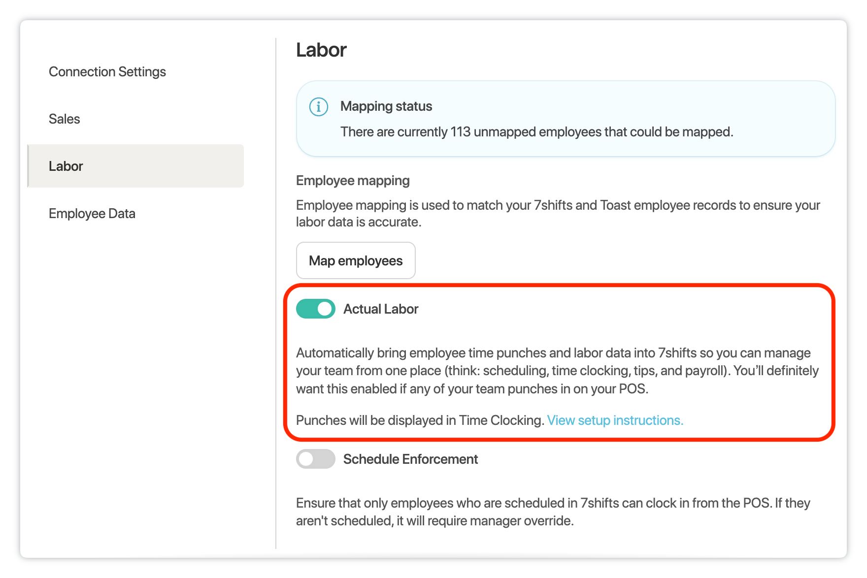 To check the status of your POS labor settings, head to Apps & Integrations > My Integrations > click on your POS > Settings > Labor. Actual Labor should always be toggled on to ensure data is coming through: