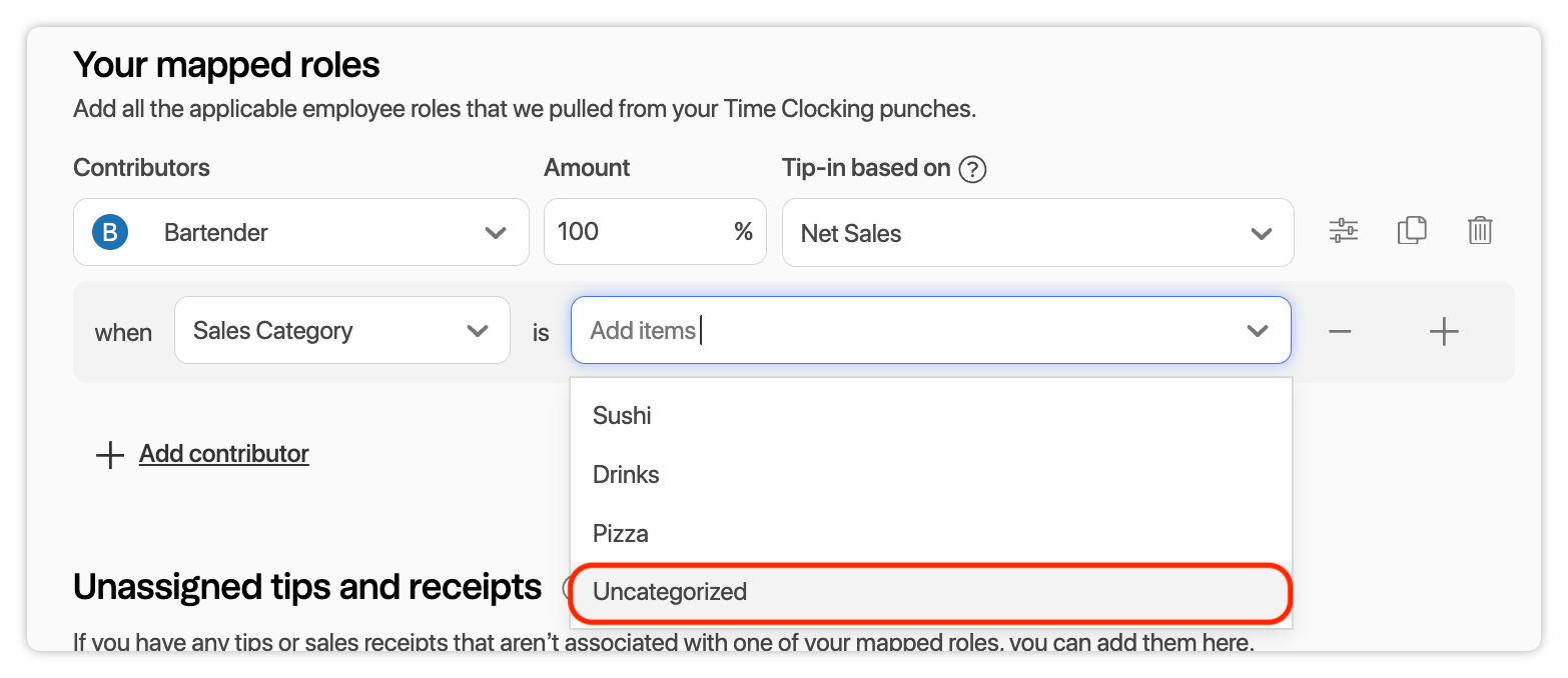 5. Determine which roles or departments will contribute to the Tip Pool. In other words, who will contribute tips? You'll notice the following two sections: Your mapped roles and Unassigned tips and receipts.