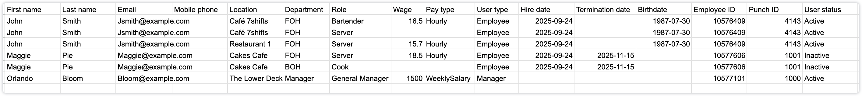 • Users with multiple assignments (different locations, departments, or roles) will appear in multiple rows in the export—one row for each distinct assignment.