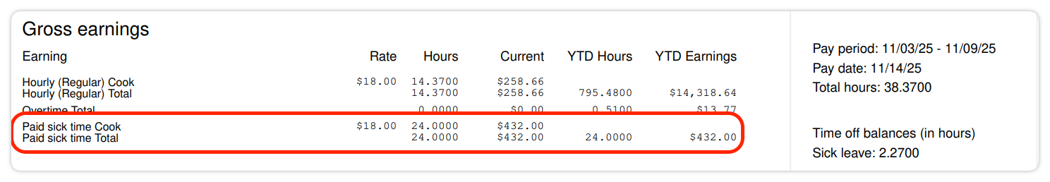 • PTO does not appear using your custom PTO policy names (for example, “Vacation – Full Time”). Pay stubs use standardized labels: Paid time off or Paid sick time.