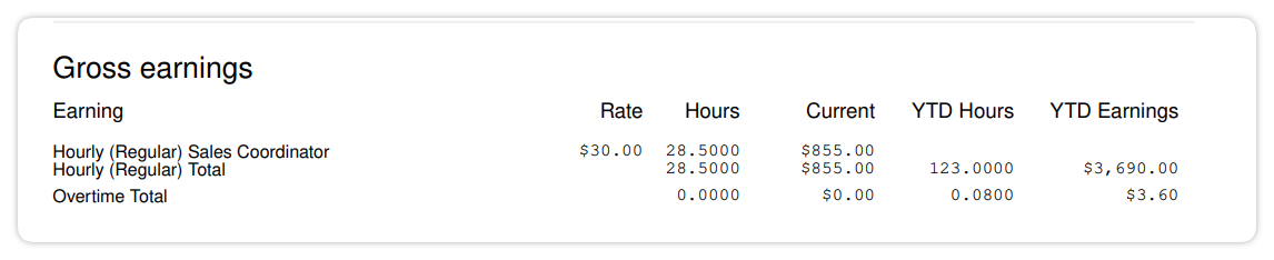 If PTO is used and paid in a pay period, it will appear as a line item in the employee’s Gross earnings.