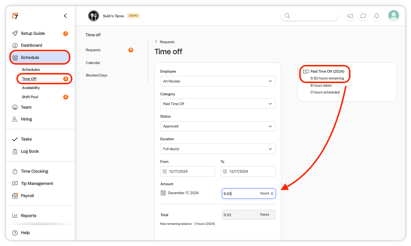 • Time Off Submission and Approval Required: All PTO payouts must be processed through a submitted and approved time-off request in 7shifts.