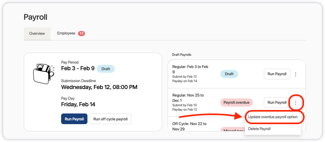 3. Click Run Payroll if you have not started a draft, or click the three dots next to an existing draft and select Update overdue payroll option.