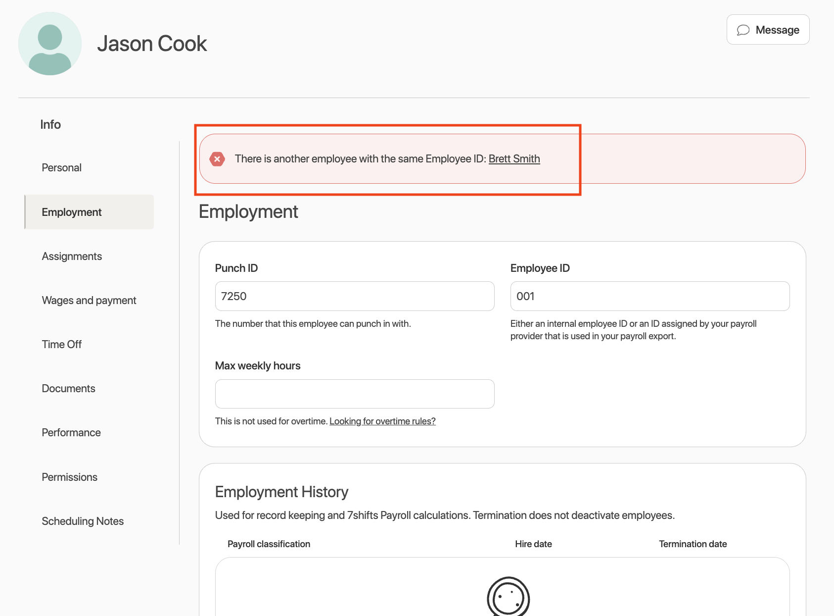 Employee IDs must be unique across all employees. When a duplicate is detected, an error message will display the name of the employee already using that ID.