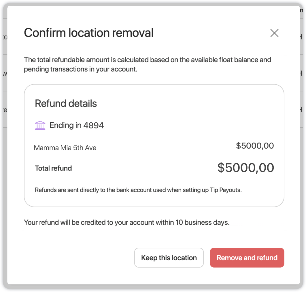 Important: Access to Tip Payouts is removed immediately upon deactivation. Refunded funds are typically credited to the account within 10 business days.