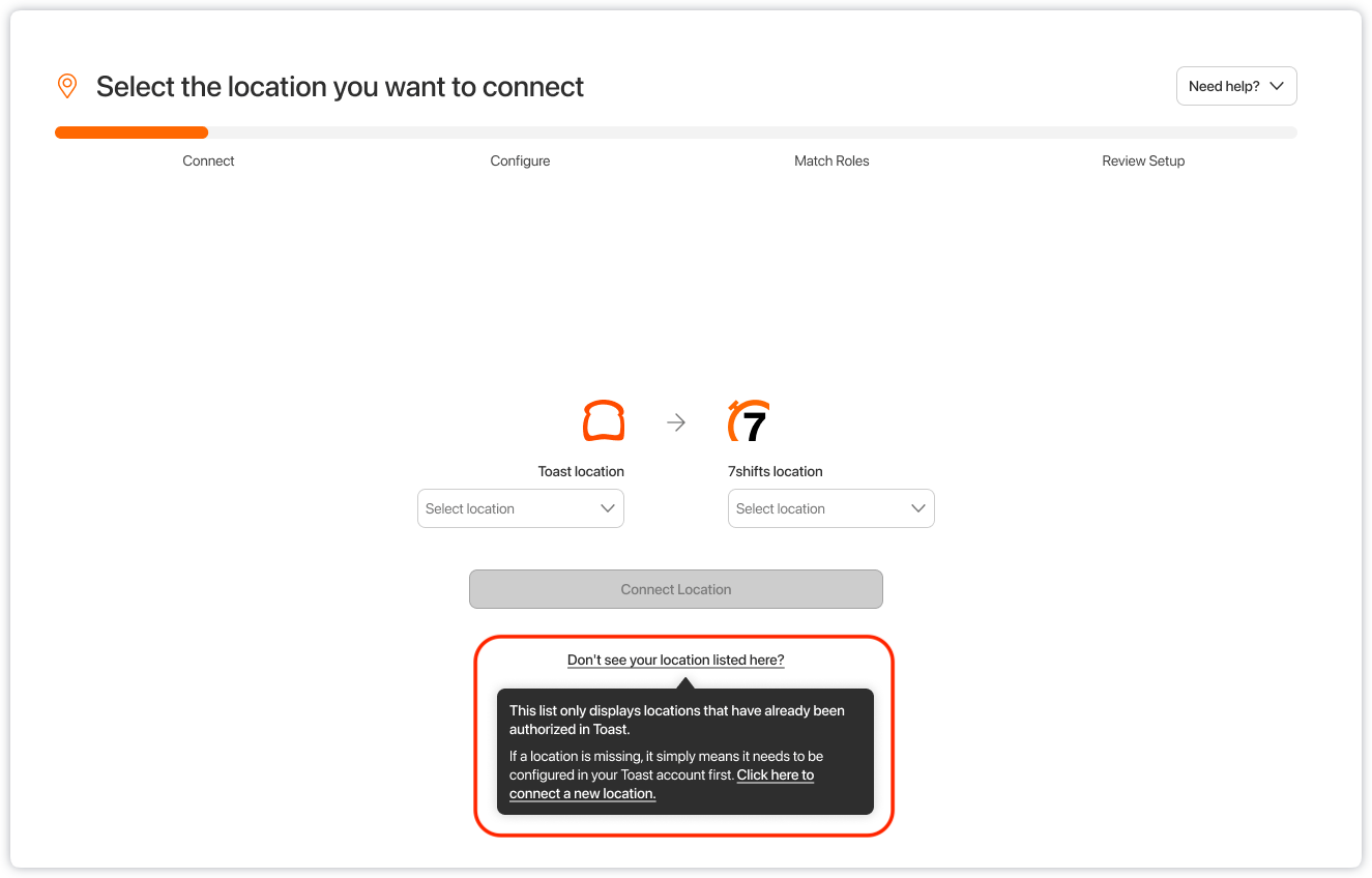 I am trying to connect a new 7shifts Location to my integrated Toast account, but the Toast location is missing from the dropdown (i.e. No options):