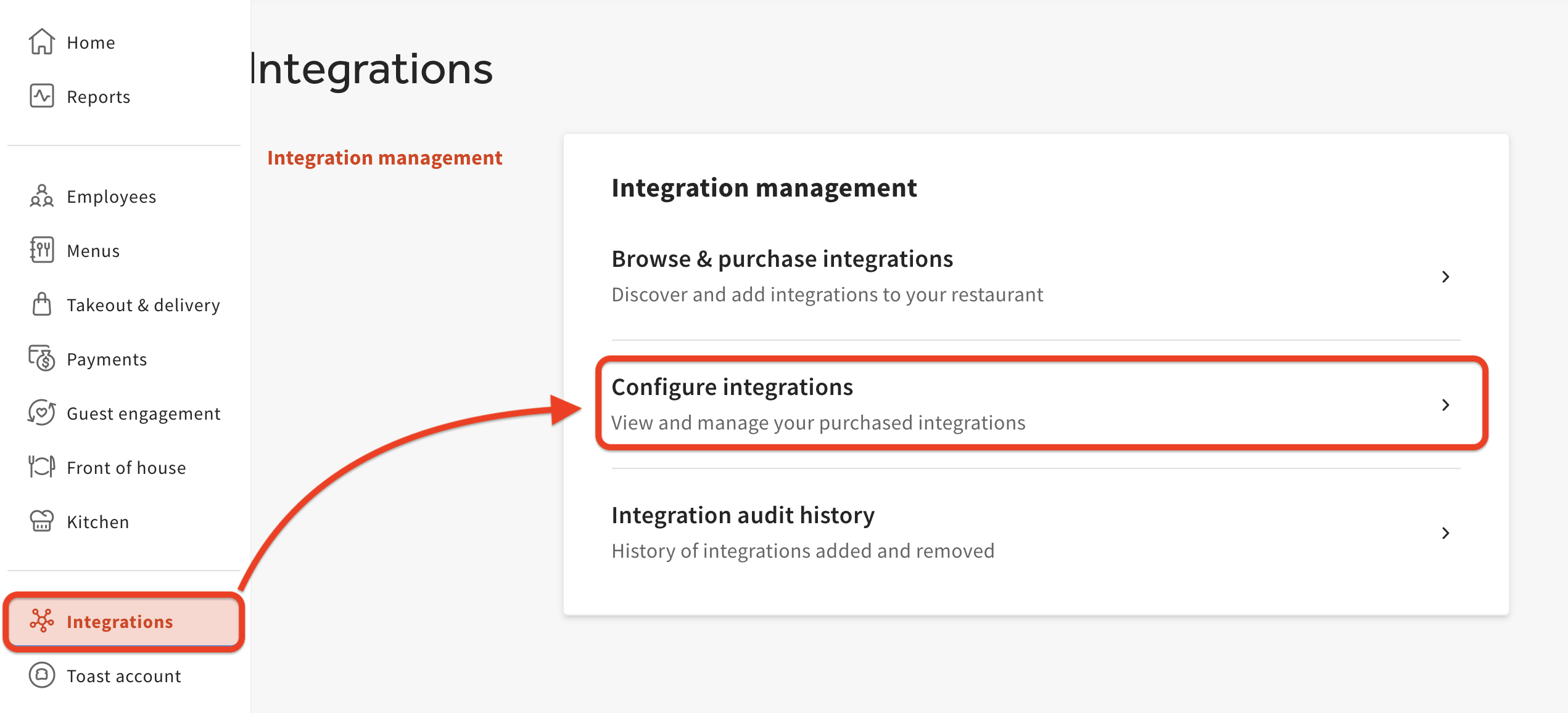 - In Toast, head to Integrations > Configure integrations