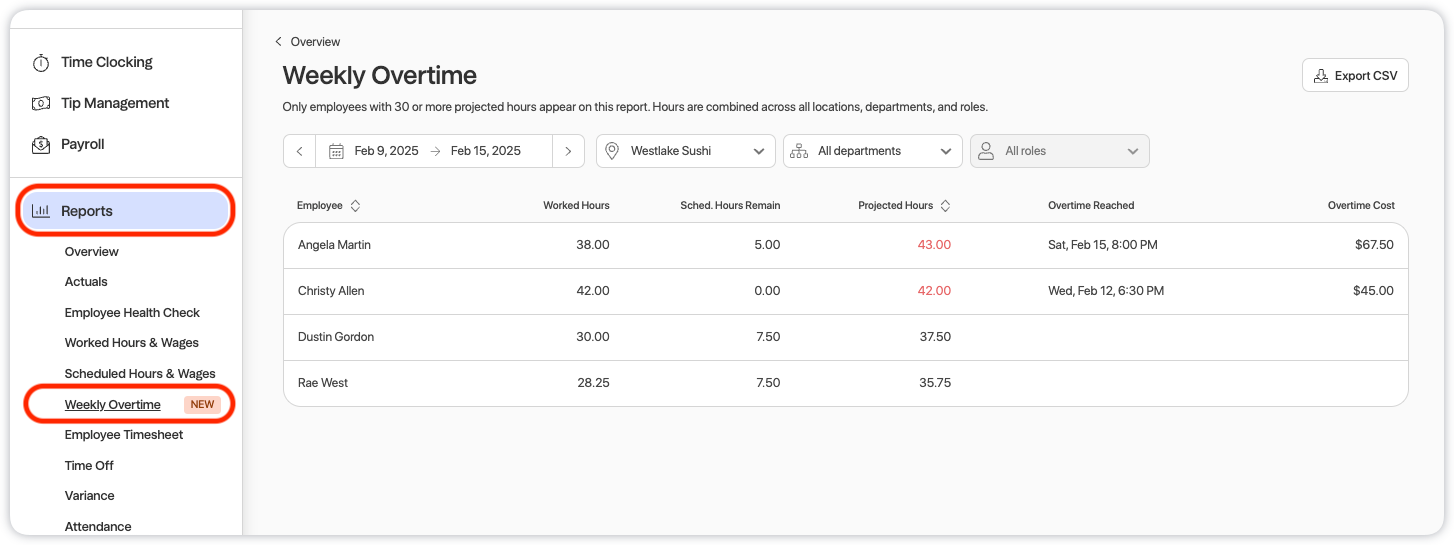 • Overtime Reached: An estimate of when an employee will reach overtime hours based on their upcoming schedule. This helps identify employees at immediate risk of incurring overtime.
