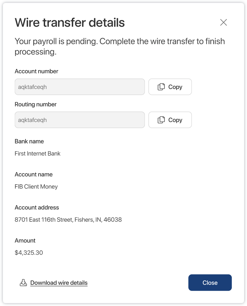 Important: These are unique wire transfer details generated for this specific failed payroll and must not be reused for any future funding, as this will prevent proper reconciliation.
