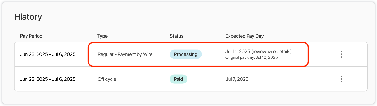 • The payroll status will update to Regular - Payment by Wire once the funds are received and reconciled.