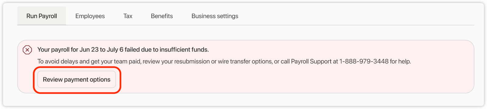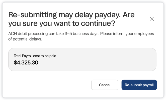 Note: Resubmitting the ACH debit can take 3-5 business days. Inform your employees of potential payday delays.