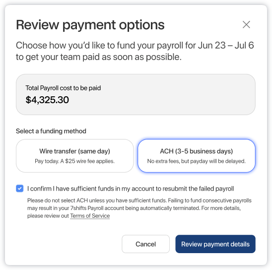 • You cannot resubmit a debit in 7shifts until the original funding attempt officially fails on payday.