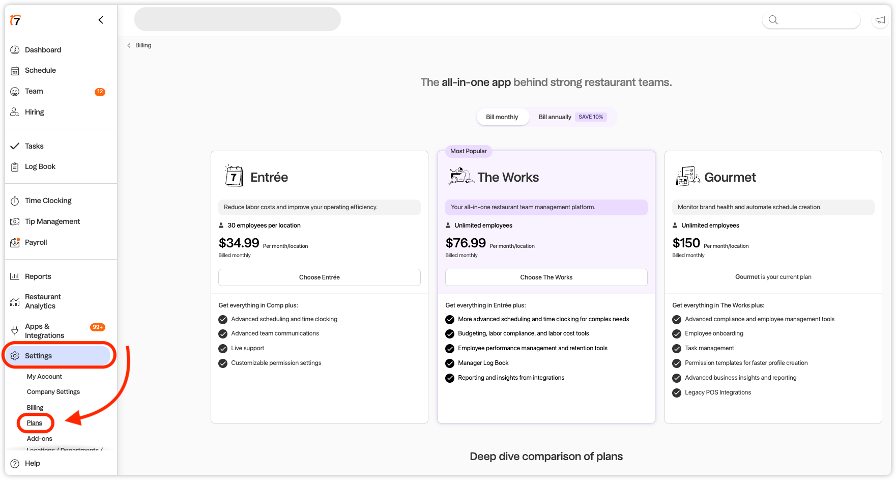 To view the features of your current 7shifts plan, including employee limits and other settings, go to Settings > Plans. This page displays your current subscription and available plan options.