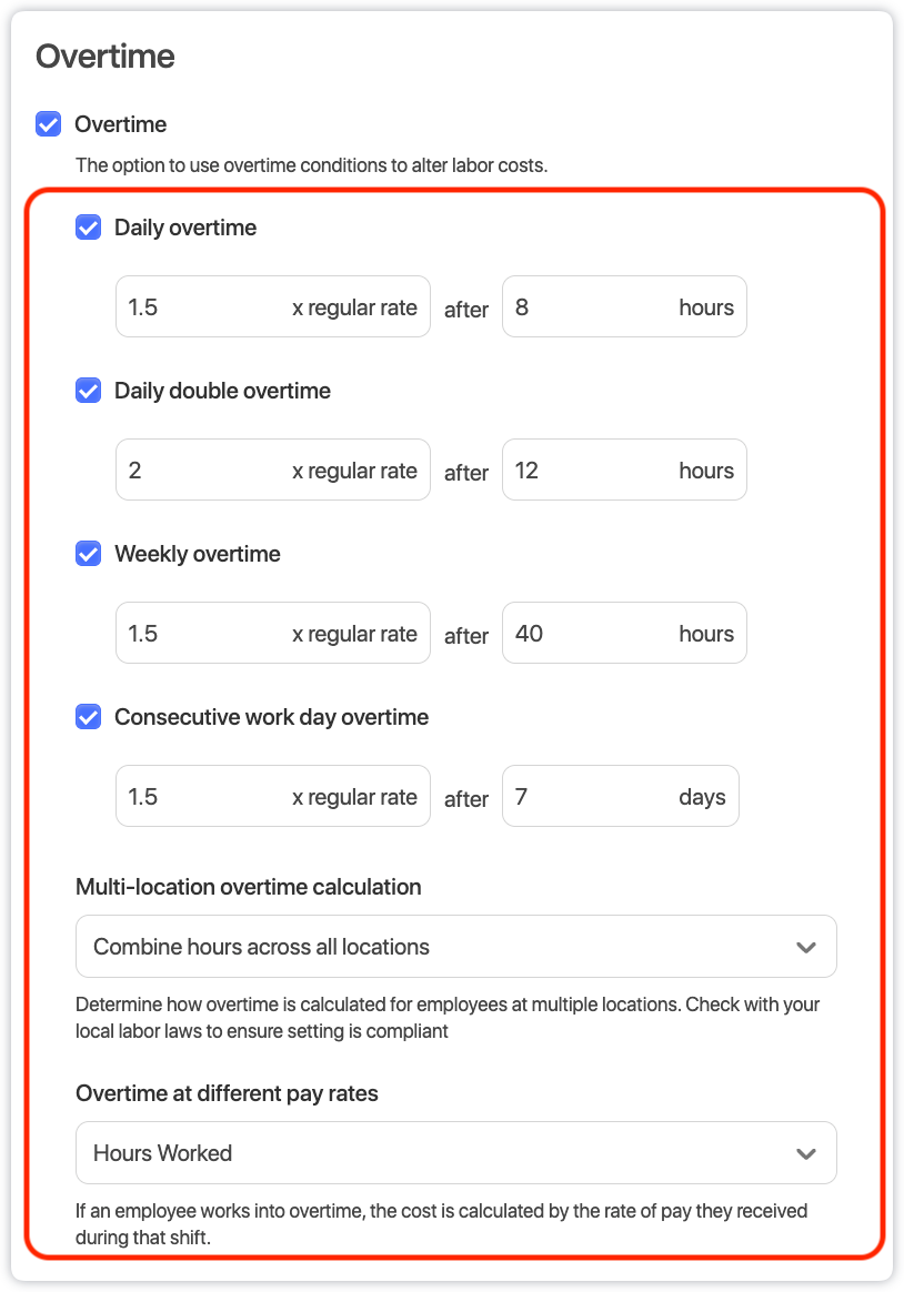 6. To set your desired Overtime rules (such as Daily, Weekly, or Consecutive Days), simply check the box next to the rule and configure the rate and hours.