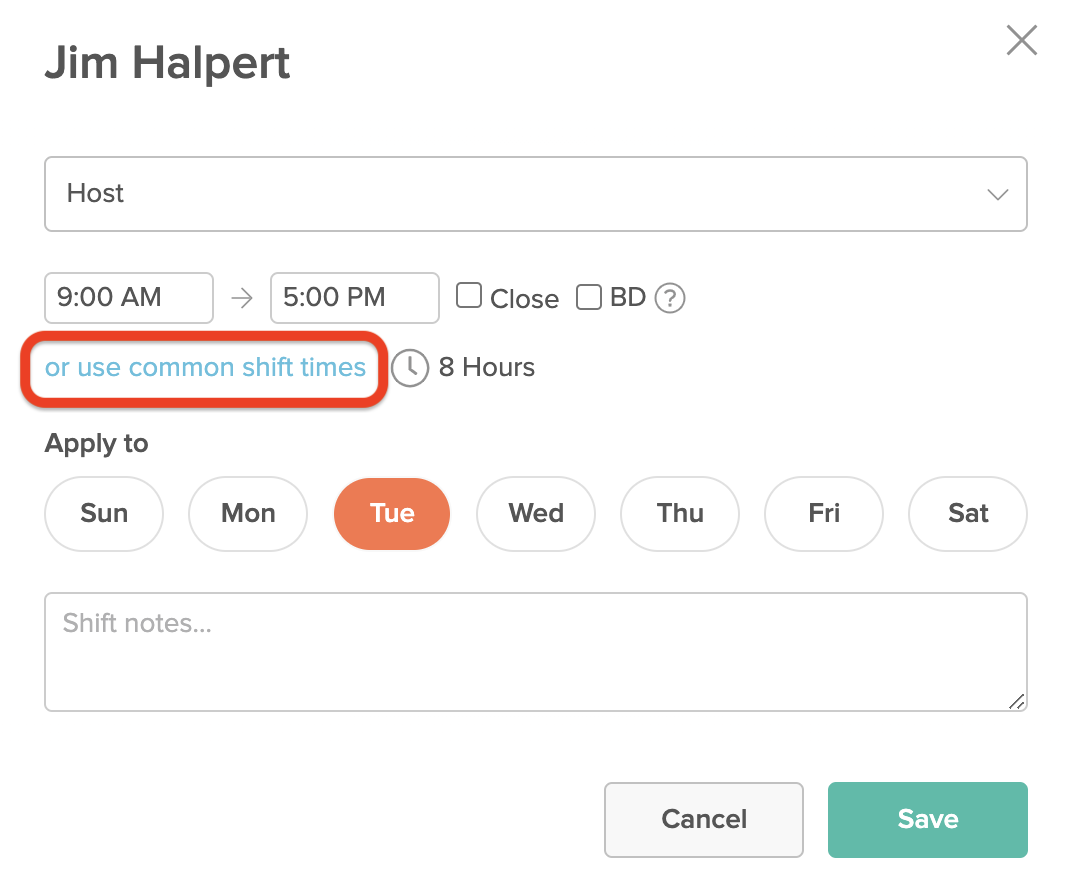 Common Shift Times are the shifts you use regularly and can help you create other shifts more quickly while building your Schedule. Specifically, they are the shift times you've used in the past 3 weeks, and are the ones you’ll most likely use again.