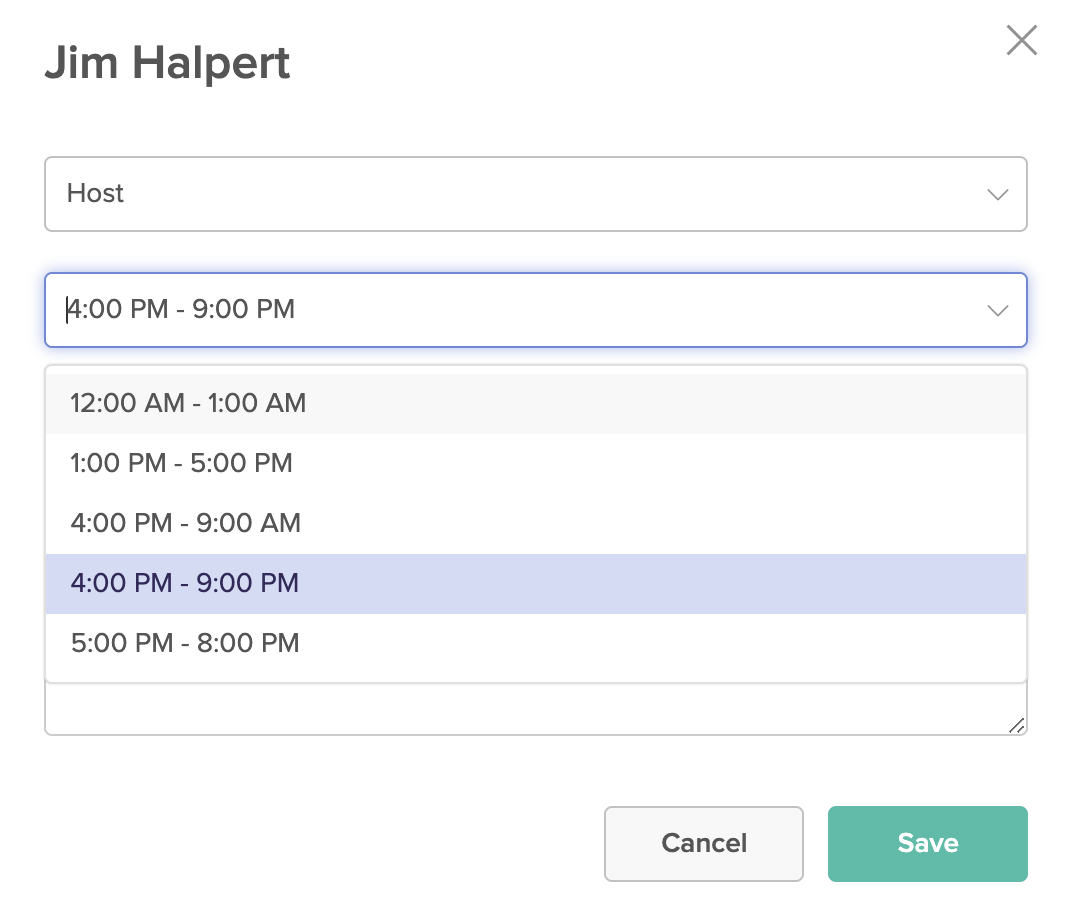 Since they are auto-created, the Common Shift Times will appear in a drop-down menu (shown below), allowing you to quickly select a shift time.