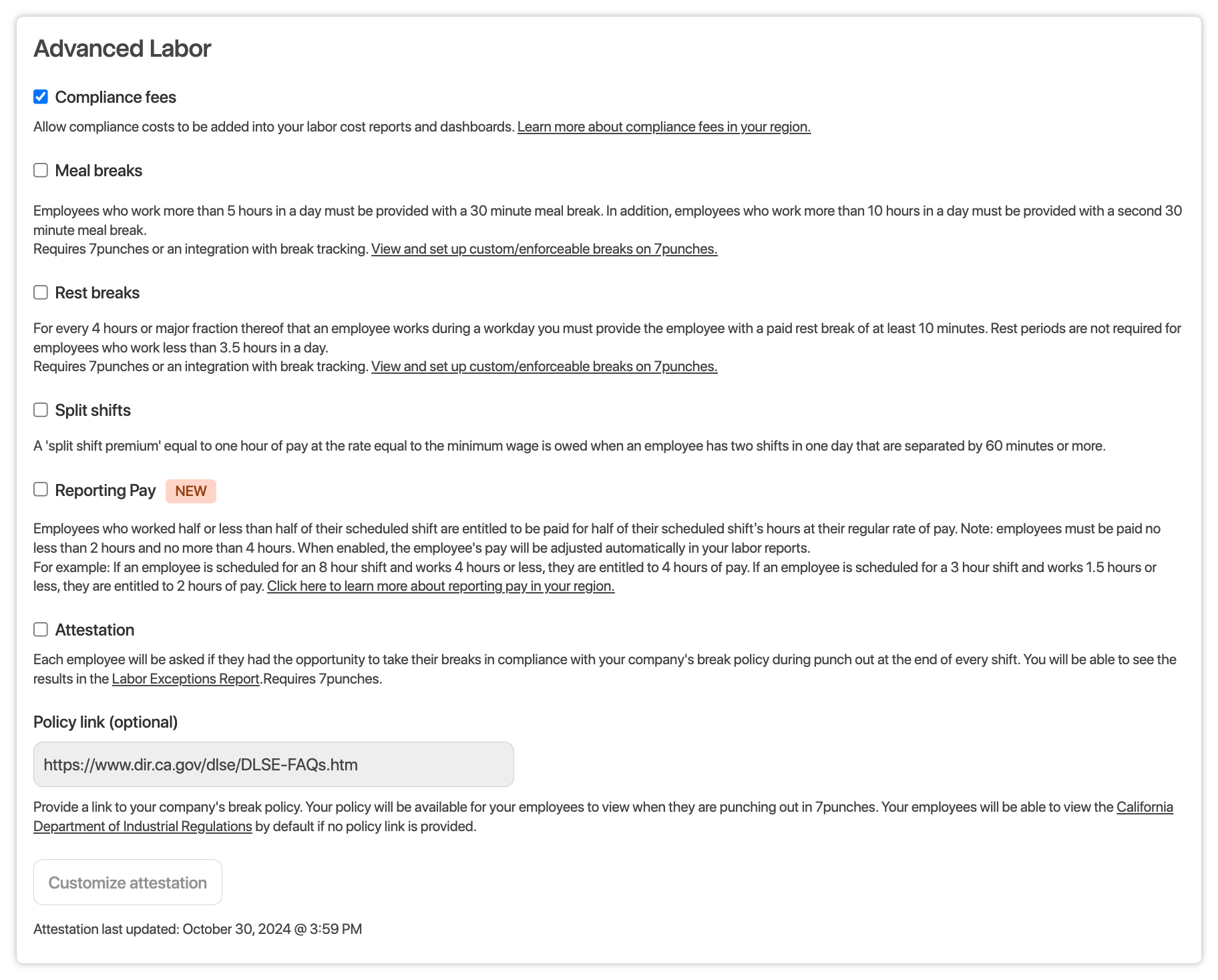 2. Under the Advanced Labor section, California labor compliance settings will automatically populate as per the Jurisdiction set earlier. Checkmark the options according to your preferences: