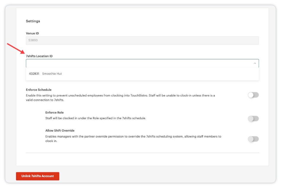 1. Click Unlink 7Shifts Account from within Touchbistro: