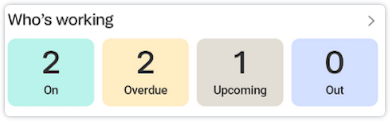 On the mobile Overview, you will find the Who’s working blocks. These blocks provide a live snapshot of your daily operations, showing the current numbers for employees who are On, Overdue, Upcoming, Out or on Break.