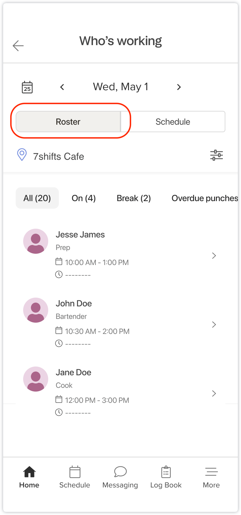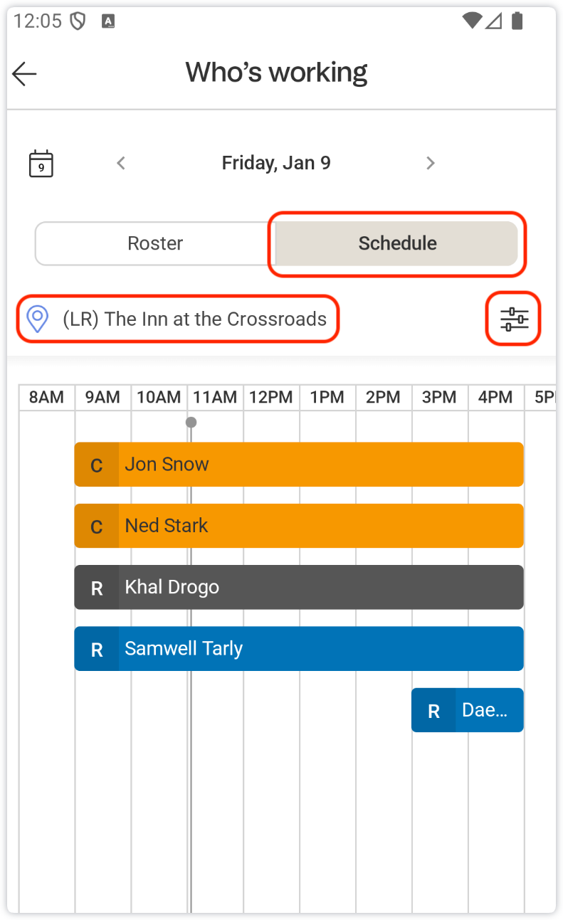 To navigate to the Who's working Schedule, tap the Who's working blocks from the Overview page and select the Schedule tab.