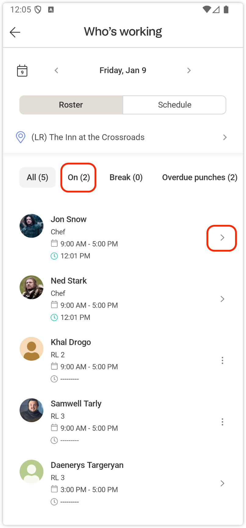 Click through the filters to see employees who are On, on Break, Overdue, Upcoming, or Out. (select the down arrows beside each view to learn more!):