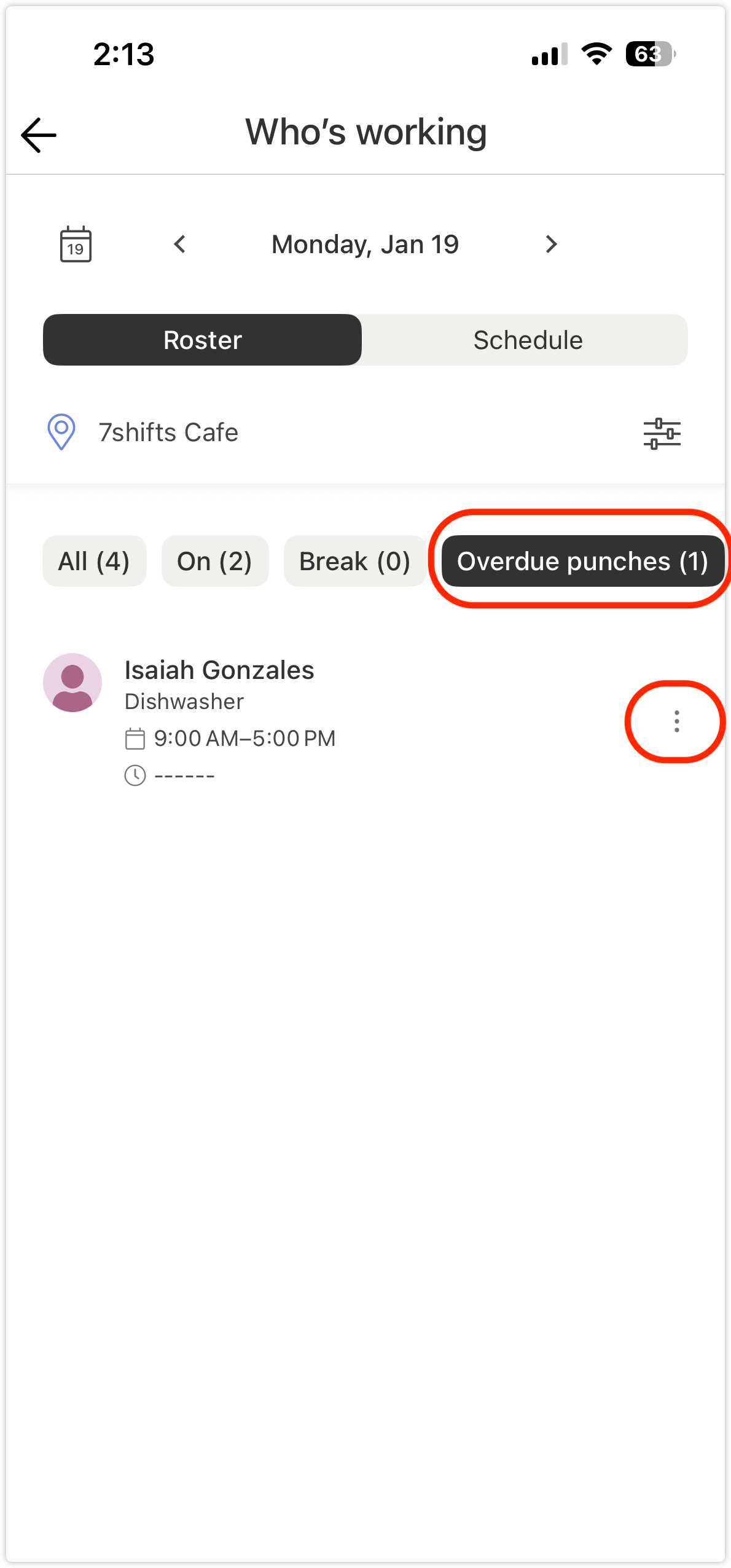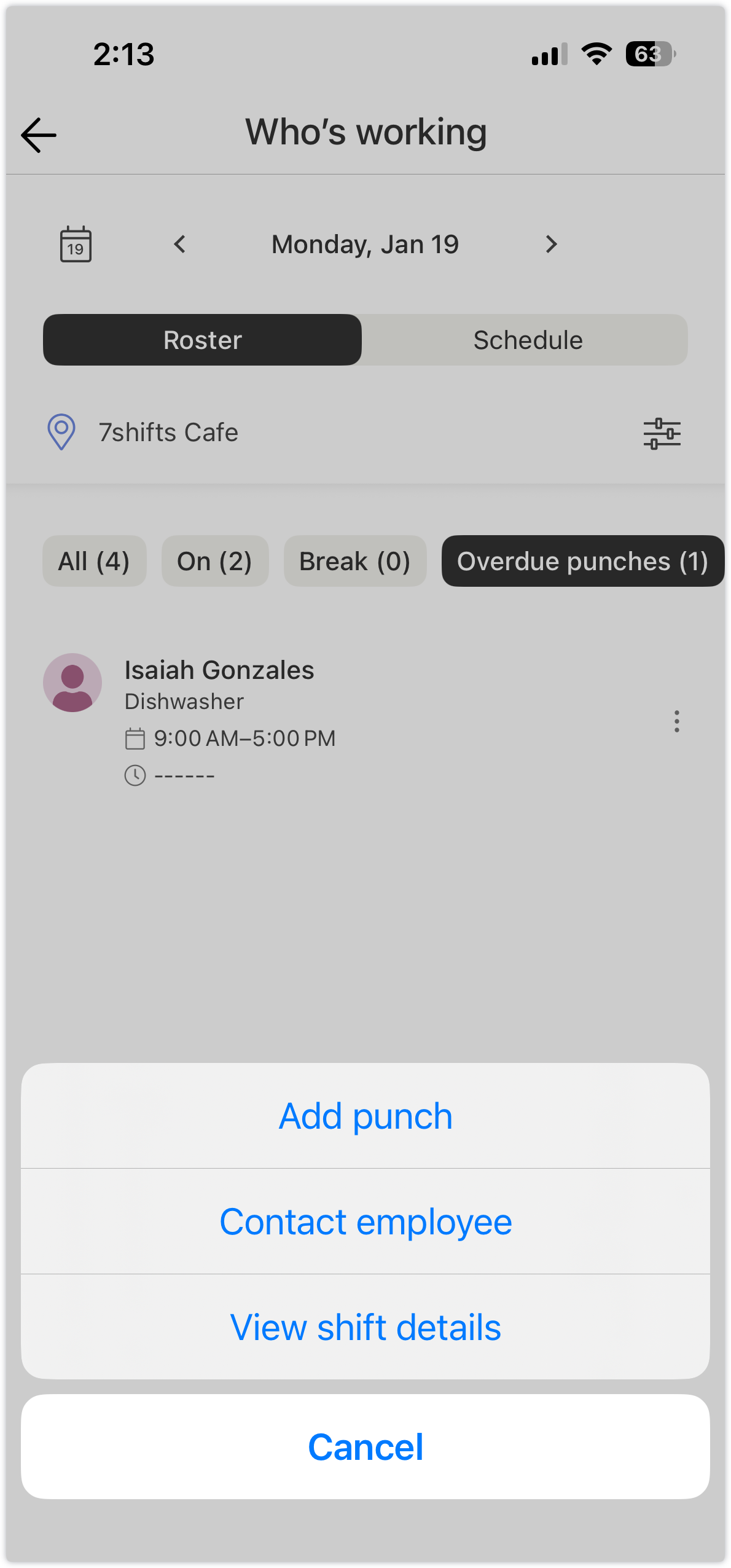Click on an overdue punch to add a punch, contact the employee, or view shift details.