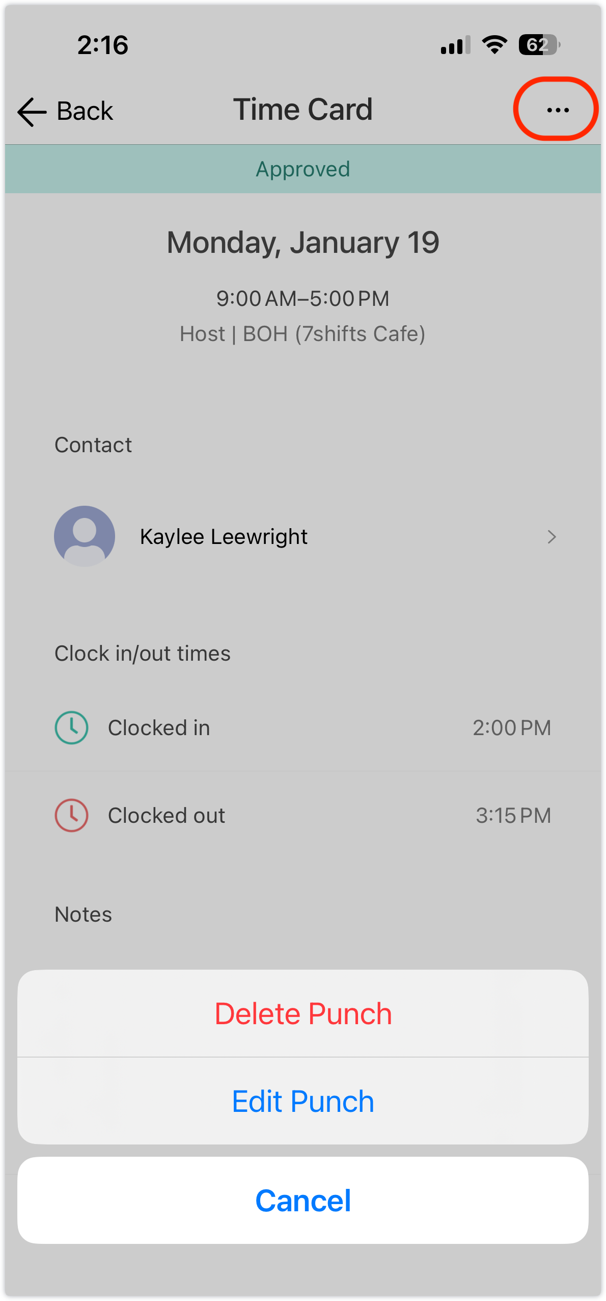 - Click on a shift to open the Time Card. Click the More options icon to edit or delete the punch.