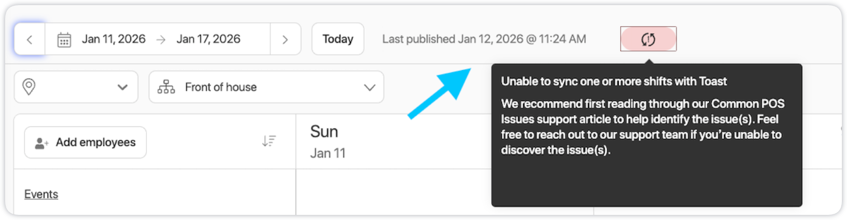 If your shifts did not sync to your POS after they were published, you may see an error message for the following reasons: