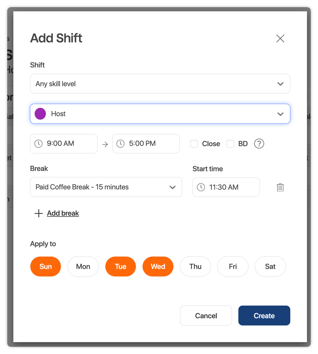 Open Shift - If you do not want to autofill shifts with employees, this creates Open Shifts on the Schedules page where you can then drag and drop to manually assign them to your employees.