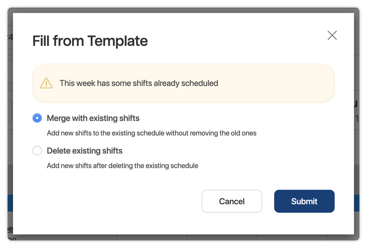 6. If there are pre-existing shifts, you will be prompted to either merge the template with these shifts or delete them: