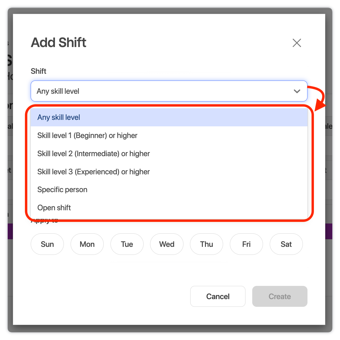 9. Add shift details including the required shift types: Skill level, a specific person, or Open shift.