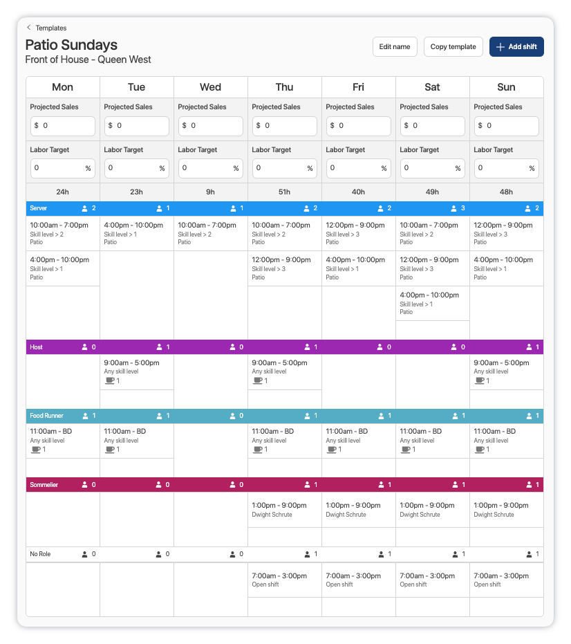 • Design a template that outlines all the shifts you need to fill, including the required qualifications such as Role and Skill Level for each position.
