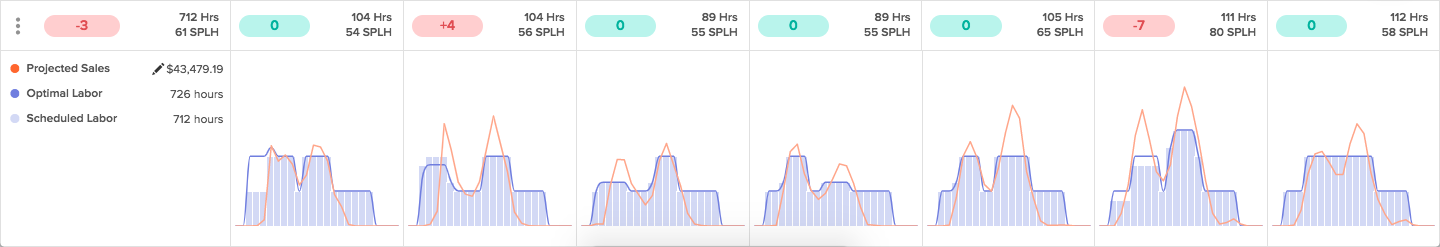 Hover over any day and hour to view Projected Sales, Optimal Labor, and Scheduled Labor hourly.