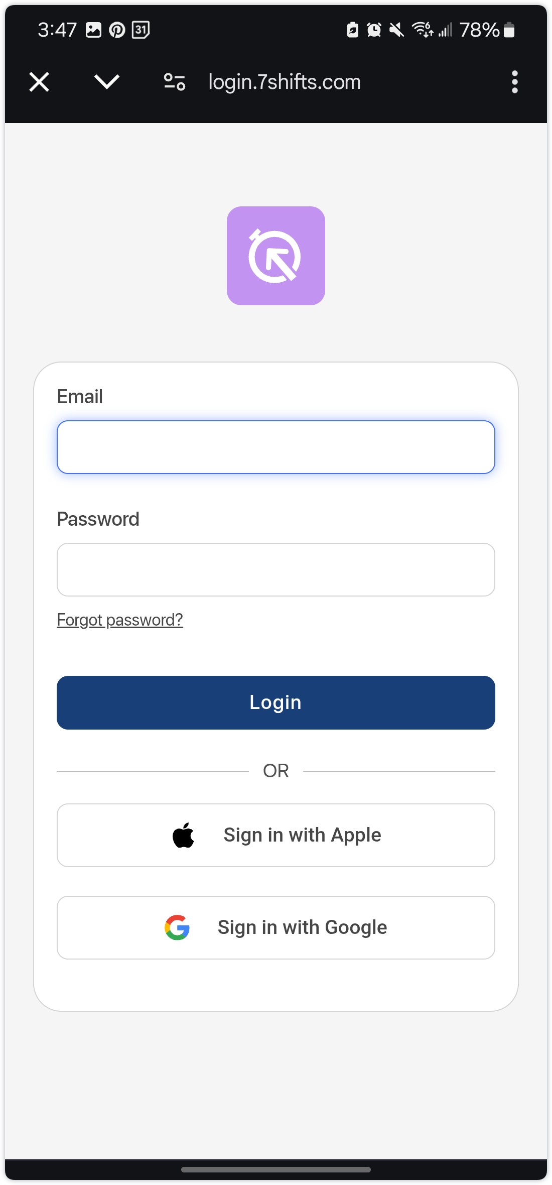 1. Sign in: An Admin, Manager, or Assistant Manager must initially sign in to the 7punches app using their 7shifts email and password (the same email and password you use to login to 7shifts).
