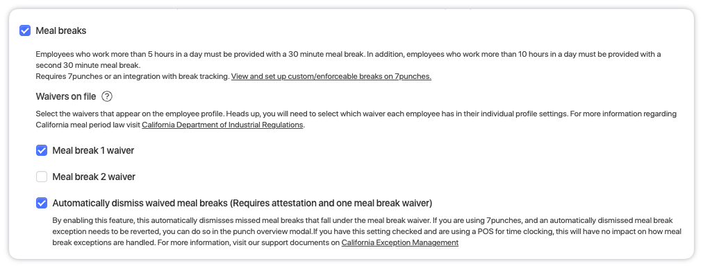 To ensure California meal break compliance, enable California Labor Compliance, turn on Employee Attestation, and use the Labor Exceptions Report to review and process any required meal break penalty pay. California law requires employers to pay one additional hour of regular-rate pay for each day a legally required meal break is not provided correctly.