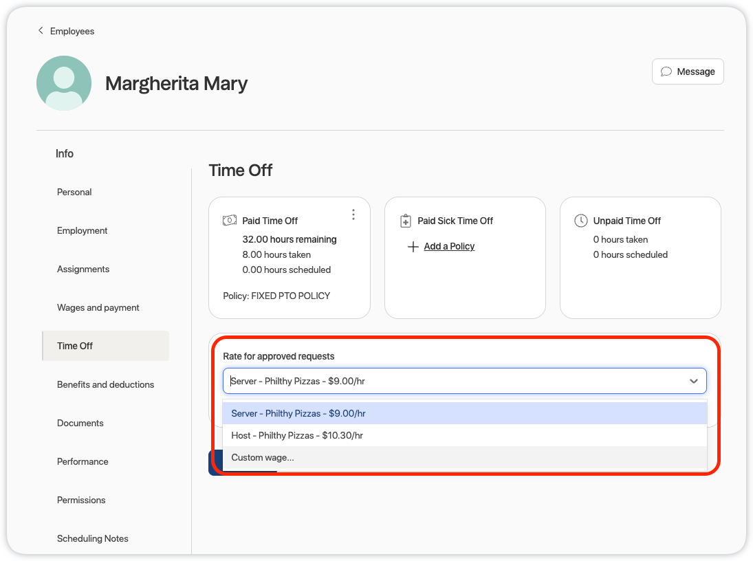2. Select the Rate for approved requests drop-down menu to choose a wage to apply to paid time off requests, or select Custom Wage to set a custom rate: