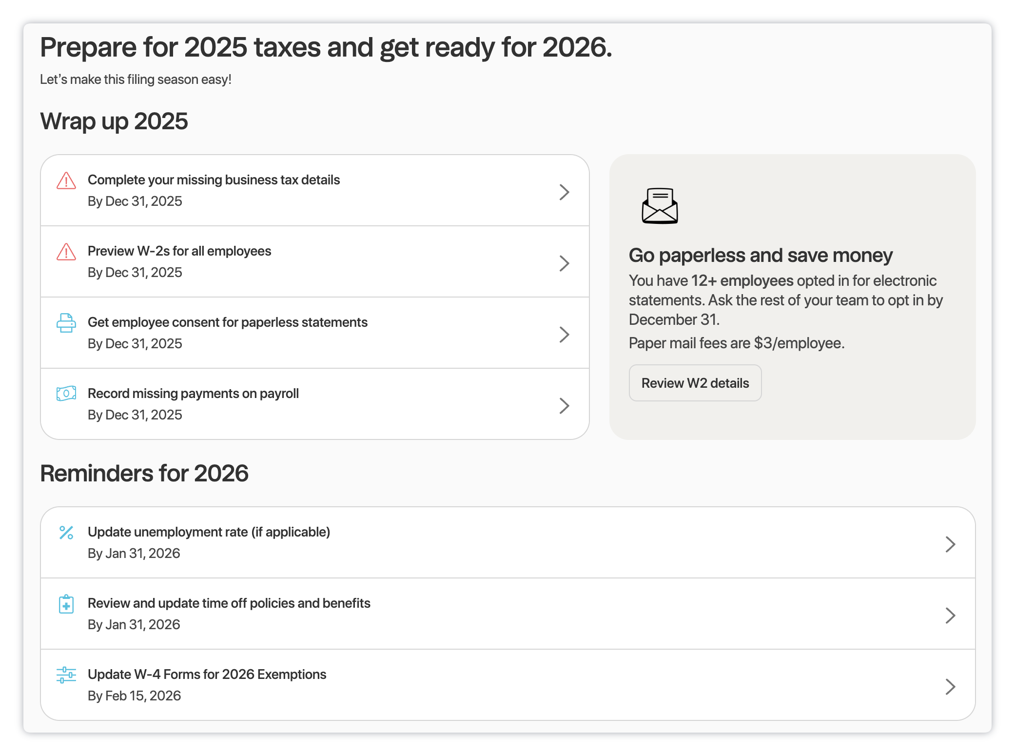We have enabled a helpful Year-End Payroll Checklist in your account to help guide you through your year-end payroll to-dos.