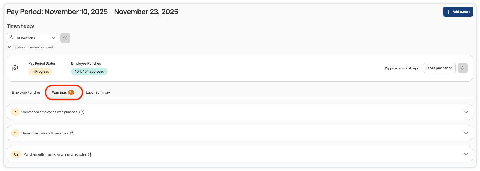 You can resolve most issues directly from this tab, and you’ll still be able to close your pay period even if some warnings remain. This update helps ensure your payroll and labor reporting stay accurate.