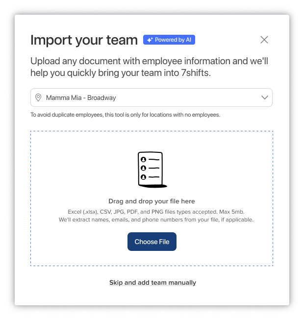 The 7shifts Employee AI Importer allows trial accounts to upload a document containing employees' information, and the tool will automatically pull key details to help you add employees quickly and efficiently. This new AI Employee Importer feature is similar to the existing AI Schedule Importer and is designed to create a better onboarding experience by saving you time when adding employees.