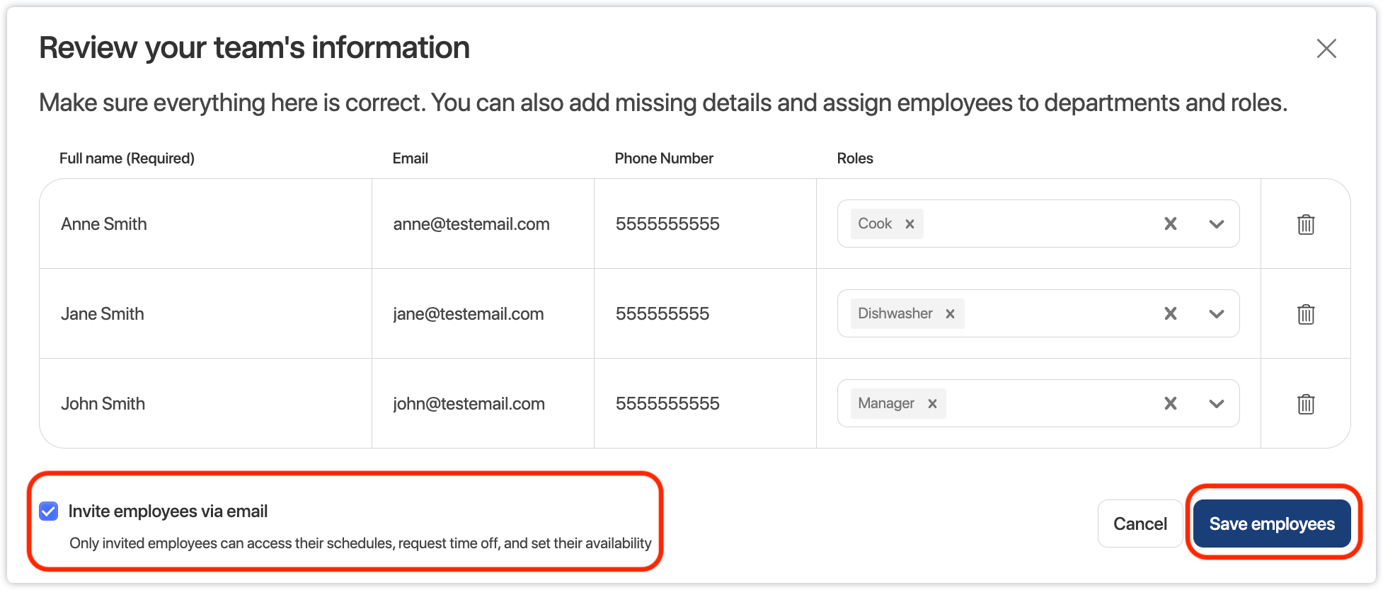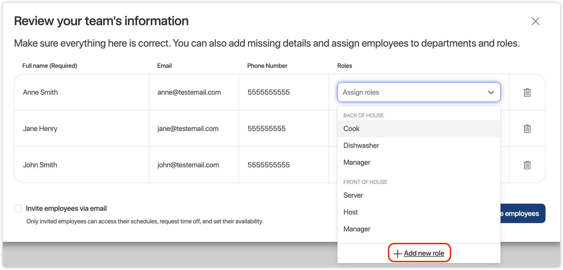 • You will be able to assign and create new Roles for your Employees directly within the review modal.